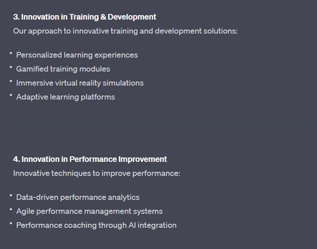 In demonstrating an AI workflow, I challenged ChatGPT to develop a presentation highlighting examples of innovation evidenced by my employer, GP Strategies.