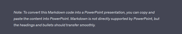 The process of entering in a few prompts and receiving worthwhile presentation outline content in seconds is precisely the type of result that legitimately justifies the hype. Moreover, by including special prompts requesting “markdown” formatting, as illustrated in this article, professionals can further streamline the transfer of content from ChatGPT→Word→PowerPoint in a rapid 1-2-3 workflow.