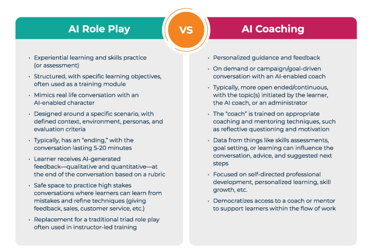 As client interest in AI grows, we’re hearing more requests to “include an AI coach.” The proper response to that is: What do you mean by an AI coach? What kind of experience are you actually looking for? It’s important to differentiate between AI role play and AI coaching because they serve different purposes.