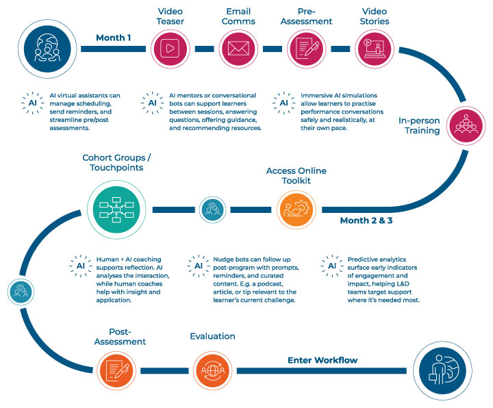 As AI tools become more sophisticated and accessible, we have an opportunity to rethink not just what blended learning includes but also how it unfolds over time. The traditional journey includes several critical touchpoints, but these steps are also potential failure points: things like scheduling, collecting feedback, or sustaining behavioral change often break down due to time or resource constraints.