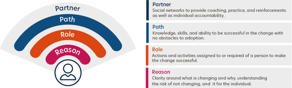 R2P2 focuses on four key elements: reason, role, path, and partner. Learning, development, and growth happen at an individual level, but stakeholders at all levels have a responsibility in effective change adoption. Leaders and sponsors are the cornerstone of successful change. Ensuring they are well equipped as advocates is critical to execute change tactics with impact and to influence through the transition to the end state.