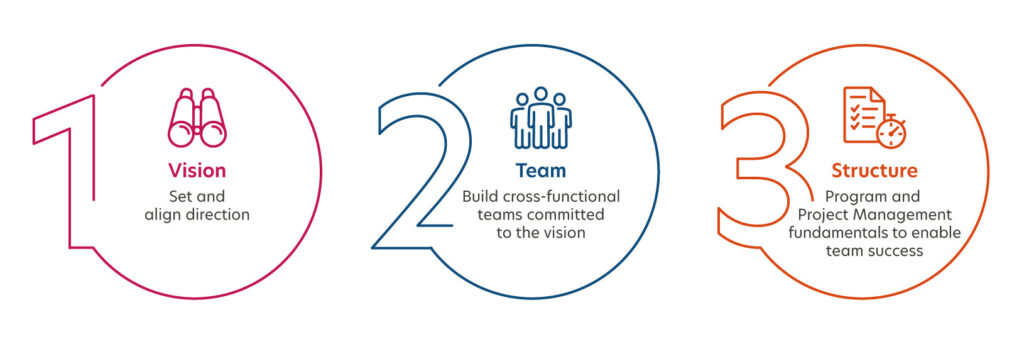 It is important to understand the difference between a program and a project. A program is large in scale and broken down into related projects. A project is a temporary endeavor undertaken to develop business solutions that drive business results. Regardless of how the effort is organized as a program or a project, the fundamentals remain. While many organizations focus on structural aspects of program and project management, our experts recognize the importance of defining a vision, building a team, and providing a structure that enables the team for success.